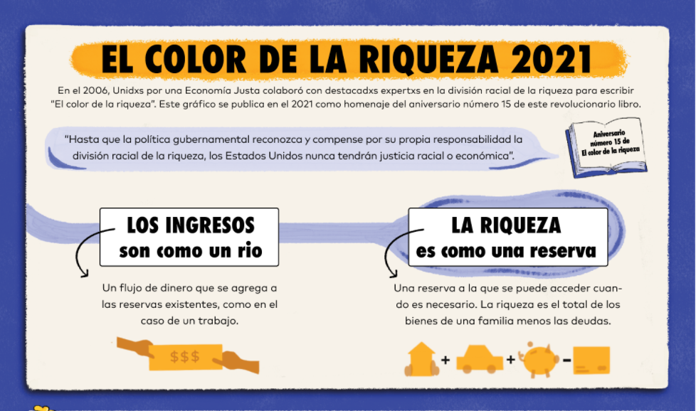 Lo alentamos a compartir esta infografía para celebrar el libro "El color de la riqueza", que sigue siendo un recurso importante para combatir la desigualdad económica en la actualidad. Este proyecto revisa y reafirma la importancia del contenido y análisis que brinda el libro, que ha ayudado a comprender mejor las raíces de la desigualdad económica racializada y el daño causado por las políticas racistas implementadas a lo largo de la historia de los Estados Unidos. Pero lo más importante, al actualizar y publicar como una infografía, estamos haciendo que la información sea más accesible y continuamos con nuestro compromiso con la educación popular y el importante trabajo de luchar por una mayor justicia racial y económica. ¡Todavía hay mucho trabajo por hacer!